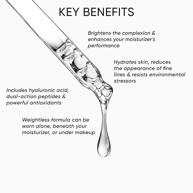 - A water-light, hyaluronic acid-based, multi-benefit serum.