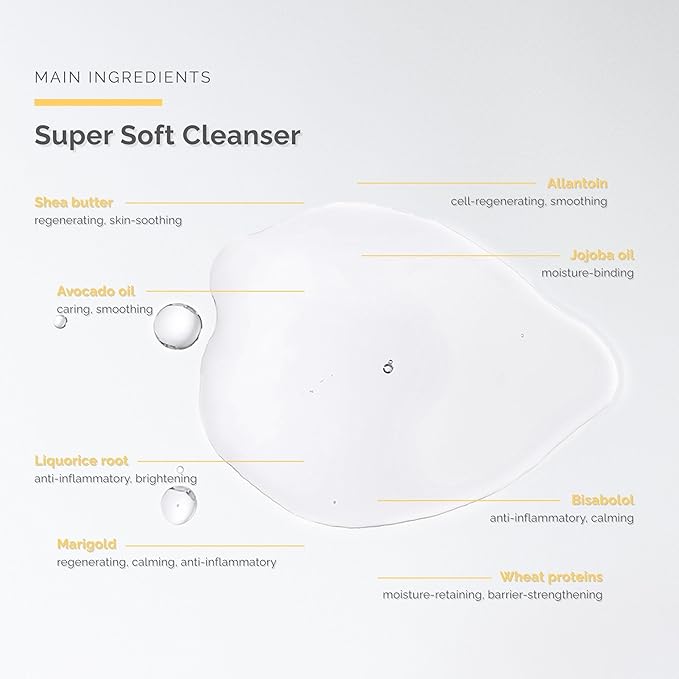 - SOPHISTICATED: Our combination of ingredients, including Shea Butter, Marigold, Avocado Oil and Wheat Proteins, causes the moisture-retaining and regenerating effect of the Super Soft Cleanser.