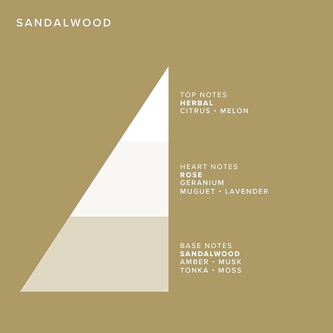 - SANDALWOOD: Soft base notes of sandalwood, tonka, and cedarwood, while delicate middle accords of lavender, thyme, and jasmine blend easily with fruity twists of pineapple and melon.Top notes of lemon and bergamot give a perfect finishing touch