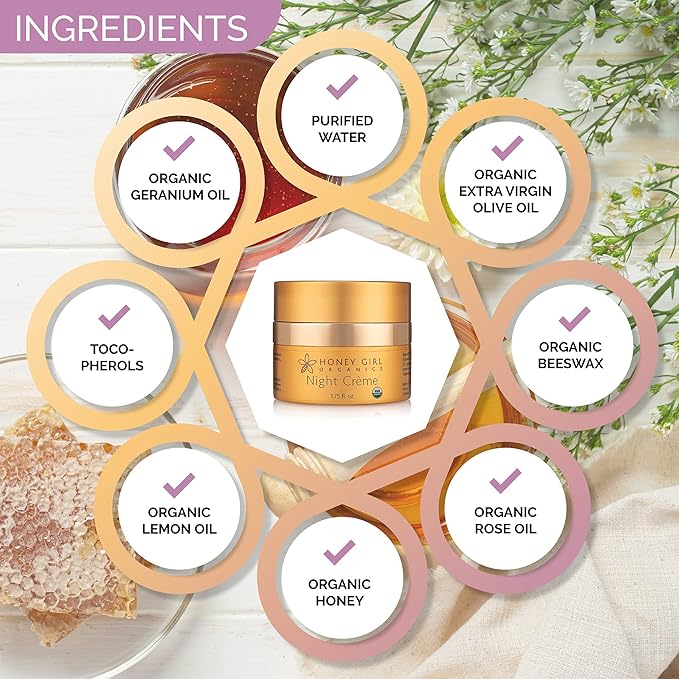 - SOOTHE AND REJUVENATE dry or damaged skin with Honey Girl Organics Night Creme. Nutrient-rich organic honey* and organic beeswax* stimulate skin repair as you sleep. *naturally contains pollen, propolis & royal jelly