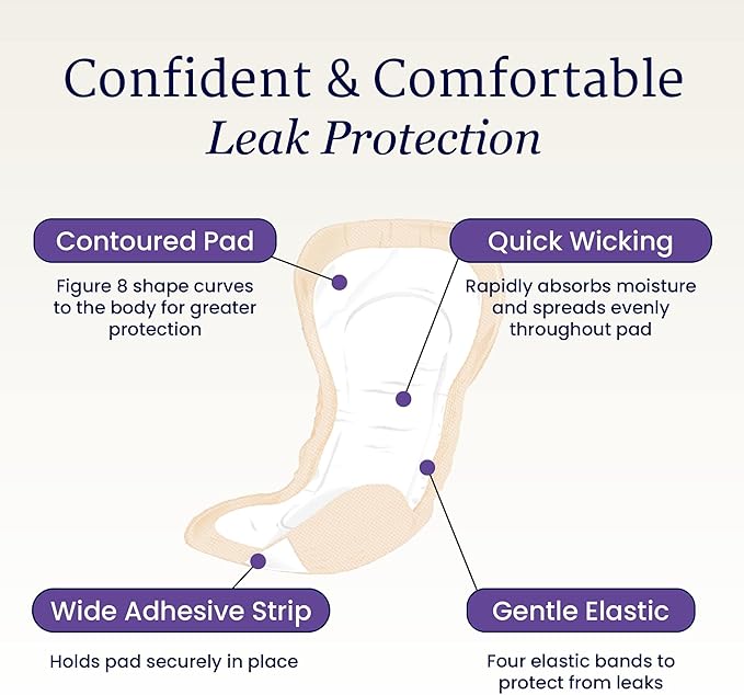 - Contoured Pad: Curves to the body for greater comfort and protection. Four elastic bands protect from leaks.
