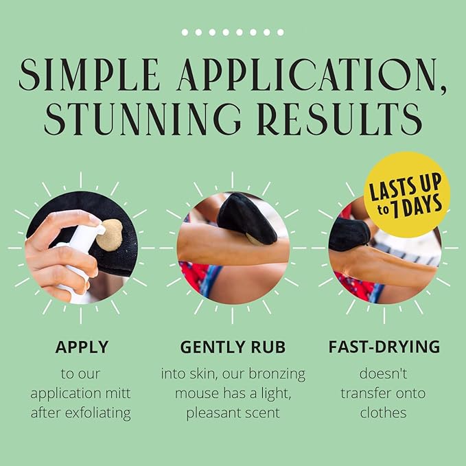 - Safe Sunless Tanner: Achieve a beautiful, glowy bronze tan without the sun; Our quick-drying self tanning mousse allows for precise application, guaranteeing a streak-free fake tan that lasts up to 7 days