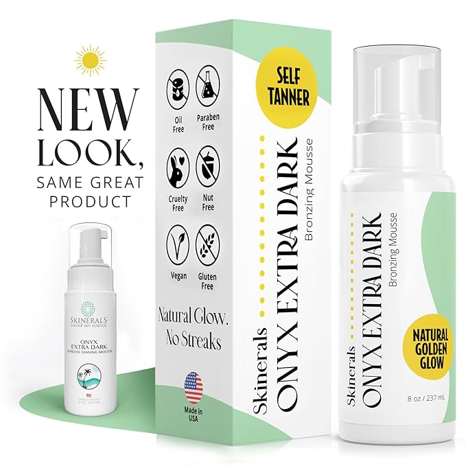 Skinerals Extra Dark Self Tanner Mousse, Organic Sunless Tanning Foam for Face & Body, Ultra Dark, Streak-Free, Quick-Drying, Long-Lasting Natural Looking Fake Tan, 8 oz, Onyx