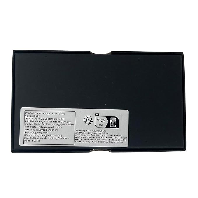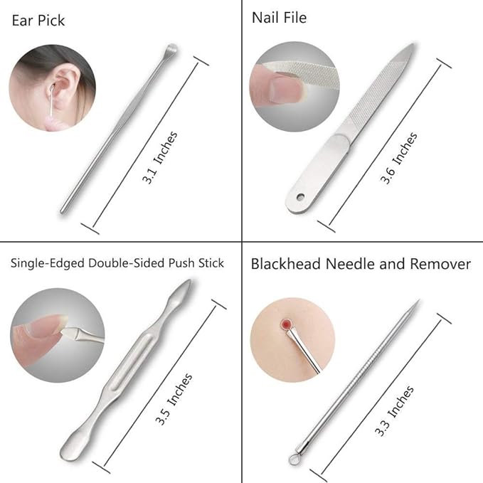 - 12PCS MANICURE KIT: Includes toenail clipper, nail clipper, diagonal nail clipper, multi-purpose scissor, cuticle trimmer, ear pick, single-edged double-sided push stick, eyebrow tweezer, peeling knife, nail file, blackhead needle and loop remover, V-shaped push Stick.