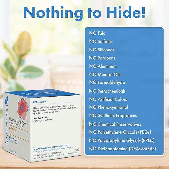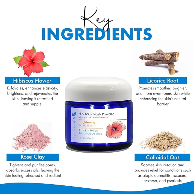 Blue Beautifly Hibiscus Clay Mask for Face | Refreshes Complexion | 100% Organic Plant Powders, Colloidal Oatmeal, & Rose Clay | Reveals Skin’s Natural Youthful Glow | 1.6 oz