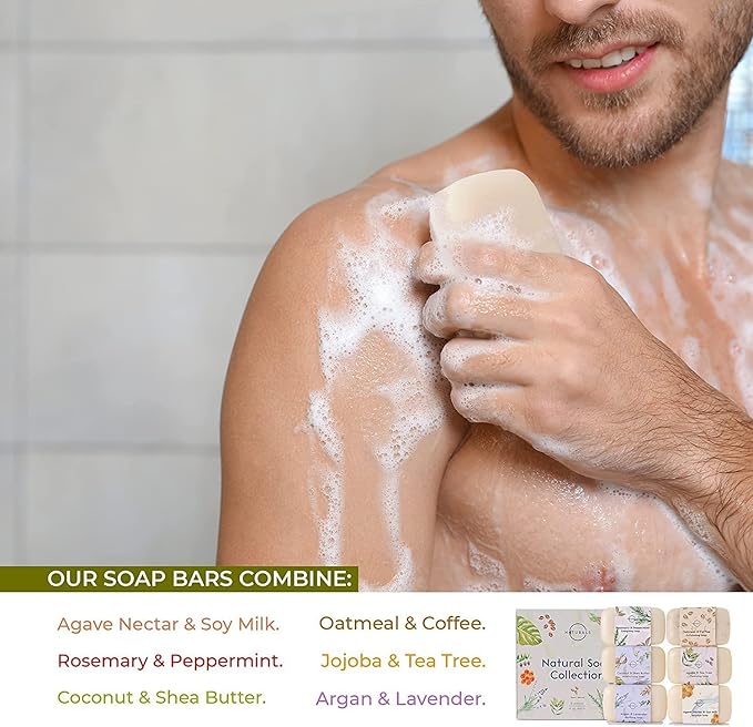 - A Perfect Soap Gift Set - O Naturals Body Soap Collection is the perfect spa gifts set for everyone who love to relax at home. Each bar is blended with cold-pressed essential oils and scents to give her the spa experience at home: Rosemary & Peppermint, Coconut & Shea Butter, Argan & Lavender, Oatmeal & Coffee, Jojoba & Tea Tree, and Agave Nectar & Soy Milk.