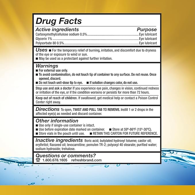 - Active Ingredients : Carboxymethylcellulose sodium 0.5%, Glycerin 1%, and Polysorbate 80 0.5%. Purpose: Eye lubricants.