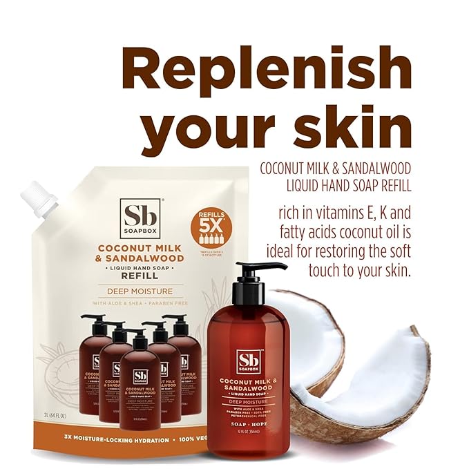 Soapbox Liquid Hand Soap, Coconut Milk & Sandalwood, Gentle & Moisturizing Hand Wash for Kitchen and Bathroom, Vegan & Cruelty Free Scented Hand Soap 12 Ounce Pump Bottles (Pack of 3)