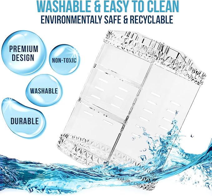 - EASY INSTALLATION & DURABLE - Makeup Storage Case features 6 layers, 1 top tier with 15 divided slot compartments, and 1 bottom tier with 4 removable shelf trays - Clear design allows for easy visibility - Beautiful display case coordinates with most décor styles - Detach and wash with ease - Made of durable acrylic plastic - Manual included.