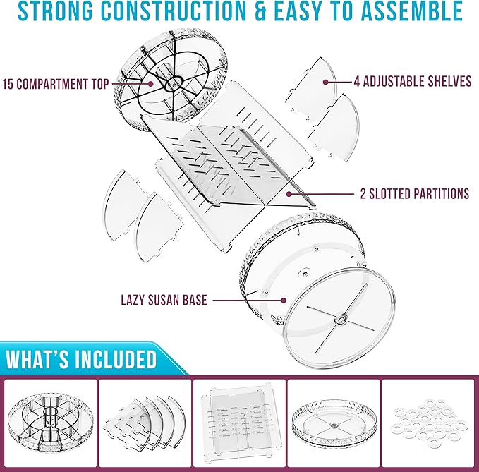 - ADJUSTABLE & PRACTICAL - Cuztomize your cosmetic organizer by adjusting the multi-level partitions to your desired height - Lazy Susan swivel base smoothly rotates 360 degrees without a sound - Simply spin the cosmetic organizer to stow or retrieve items - Steady base ensures cosmetics stay in place during rotation - Keep go-to items in one place for easy access.