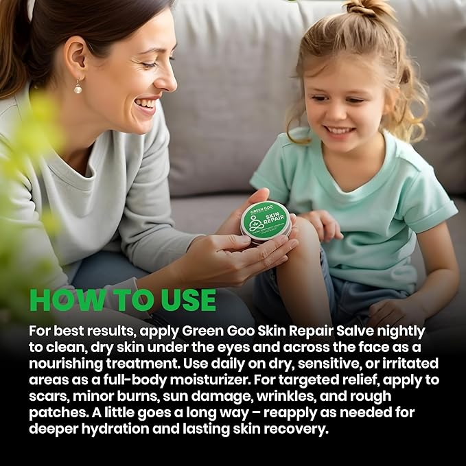 - Green Goo's Skin Repair is a multi-purpose, skin-rejuvenating salve and daily moisturizer