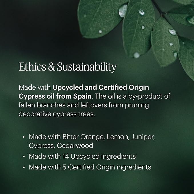 - Sustainably Sourced & Upcycled Ingredients Crafted with 14 upcycled ingredients and 5 certified origin essential oils, including cypress from Spain, this fragrance is both eco-conscious and luxurious. By using by-products from pruning, we reduce waste while delivering a rich, high-quality scent experience. "High-quality fragrance, worth every penny!"