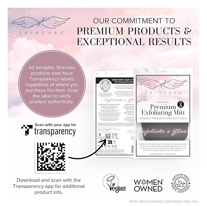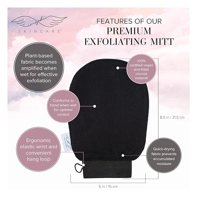 - INDULGE IN AN AT-HOME SPA EXPERIENCE – At Seraphic Skincare, we’re committed to offering premium exfoliating products at affordable prices. We invite you to immerse yourself in the luxurious experience of exfoliation and self-care at home by adding our Korean-style exfoliating mitts to your beauty routine for that glow you’ve been dreaming of!