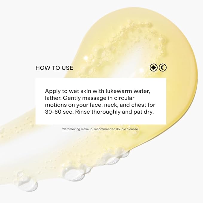 - How To Use - Wet face with lukewarm water (never hot!). Apply a quarter-sized amount to your wet palms. Lather well. Massage into skin for 30-60 seconds. Rinse off thoroughly with lukewarm water; pat dry. If you have makeup on, we recommend double-cleansing.