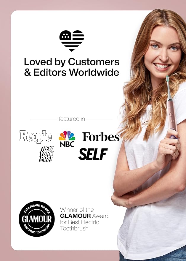 - What's in the Box – 1 Satin Rose Gold Smart Toothbrush, 8 DuPont brush heads, 1 custom travel case, user manual, warranty card..