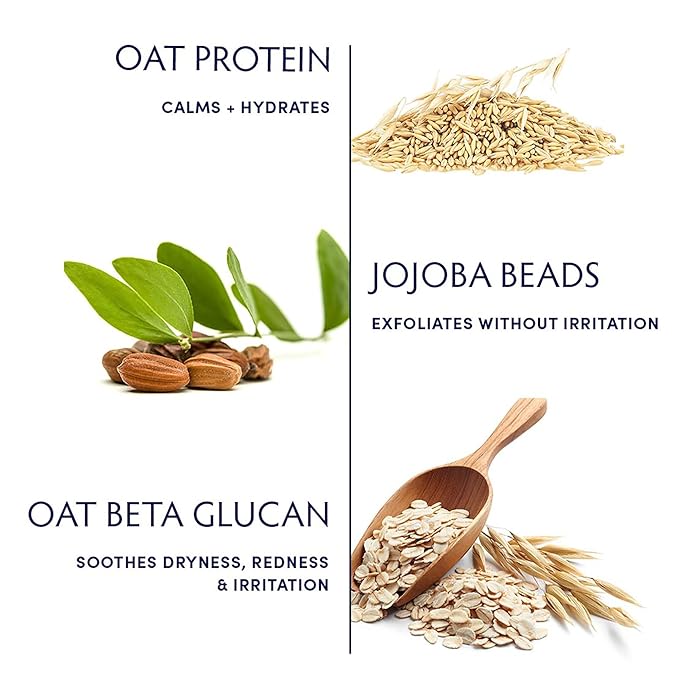 - Exfoliating Face Wash: Jojoba Beads gently exfoliate without damaging the skin barrier, Oat Protein hydrates skin, while Oat beta glucan helps soothe dryness and redness