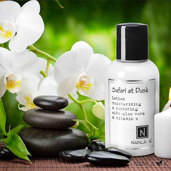 Nabila K Summer Safari Gift Set – Includes Summer Heat Soap, Safari at Dusk Body Lotion, Vanilla Cream Lip Polish & Peppermint Lip Balm – Luxury Bath & Body Kit for Women & Men – Ready-to-Gift Spa Box