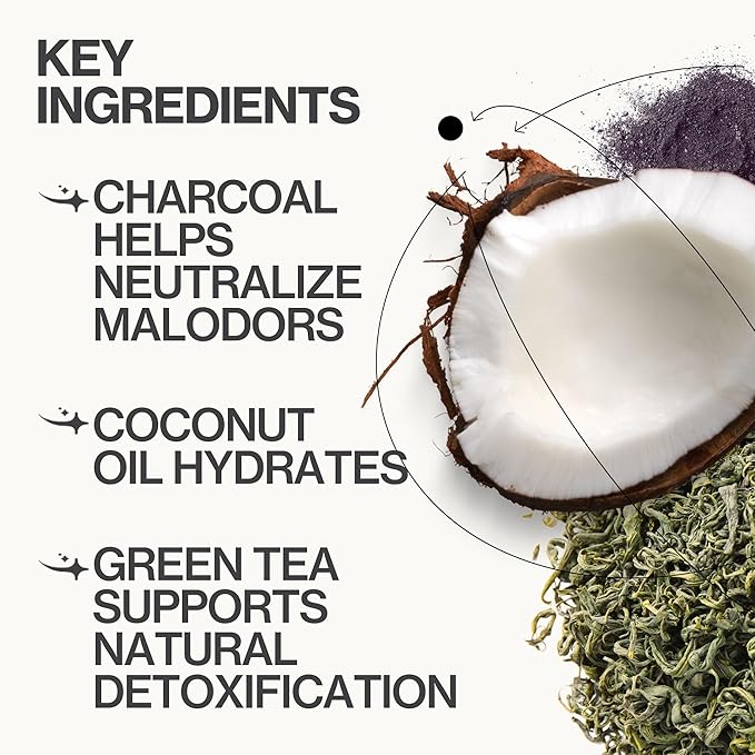 - NOURISHING COCONUT & CHARCOAL FORMULA – Experience the power of natural ingredients. Activated charcoal purifies and draws out toxins from pores, while arrowroot powder absorbs excess sweat to keep you feeling fresh and dry. Hydrating coconut oil and gentle apricot powder work together to condition and renew your skin without stripping moisture. Enjoy a light tropical coconut scent after each use, with no lingering charcoal smell.