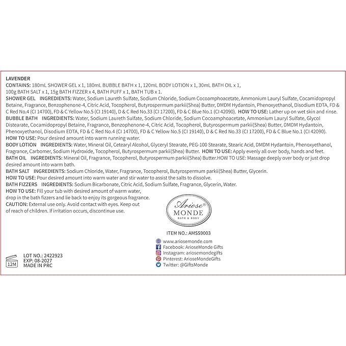 - LONG LASTING FRAGRANCE: Sweet and beloved lavender scent, using the principle of fragrance retention by essential oils, gently cleanses with a pampering lather to leave your skin moisturized long after the bath. Pamper yourself with this luxurious collection of spa products