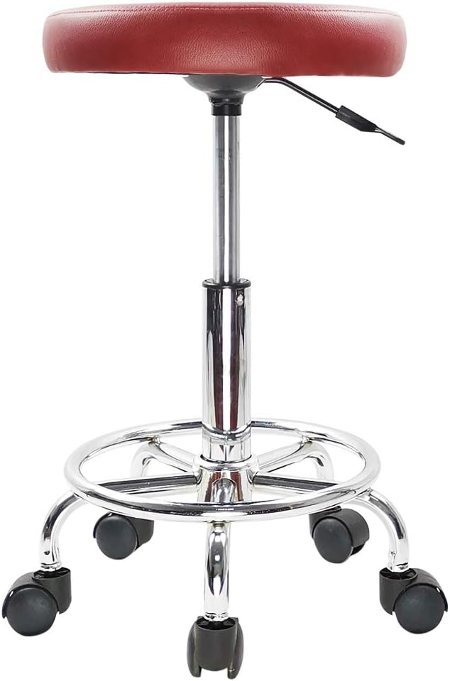 KKTONER PU Leather Round Rolling Stool with Foot Rest Swivel Height Adjustment Spa Drafting Salon Tattoo Work Office Massage Stools Task Chair Cushion 14 inches (Red)