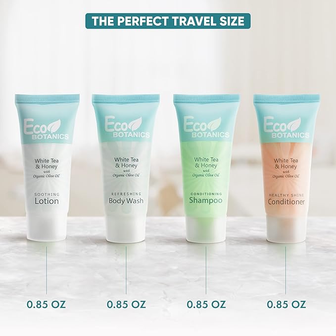 Eco Botanics Toiletries Set | 1-Shoppe Amenities Kit | 0.85oz Shampoo & Conditioner, Body Wash, Lotion | Travel Size | 80 Pieces