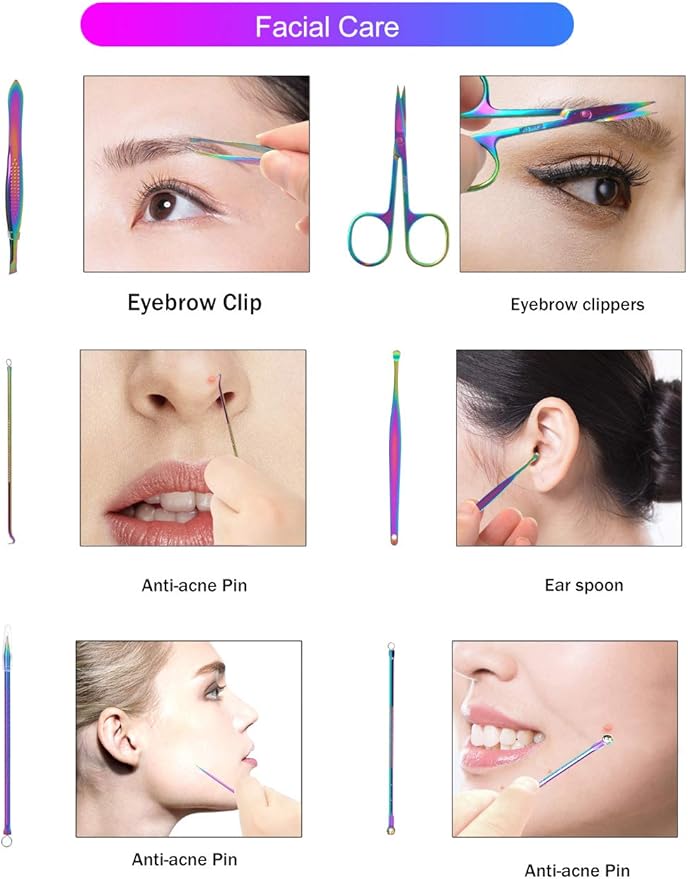 - 【 EXQUISITE TECHNOLOGY】:Made of top high stainless steel and are produced with highest standards to ensure every tools are pretty and sturdy not only using comfortable, but also easy to trim. You don’t have to buy another fingernail clippers, toenail clippers, nail cutter, nail file, nose hair scissors, facial hair scissors,tweezers,ear pick,blackhead remover, pedicure kit.With this nail kit, money can be saved, and convenience can be provided.