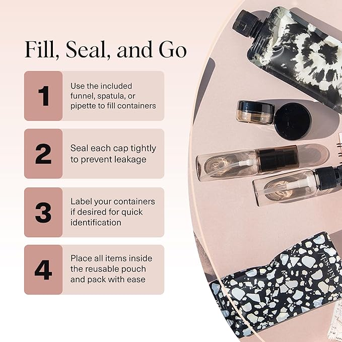 - COMPLETE 11-PIECE TRAVEL KIT - EVERYTHING YOU NEED FOR YOUR BEAUTY ROUTINE - This travel size container set includes everything you need to store and carry your beauty and grooming products. It features 1 x 30ml spray bottle, 2 x 30ml pump bottles, 2 x 0.35oz mini jars, 3 x 90ml flat pouch bottles, and 1 x 1qt reusable travel pouch, along with mini funnel, mini spatula, and mini pipette. This versatile travel bottles for toiletries kit is perfect for shampoos, conditioners, lotions, oils, and other liquids.