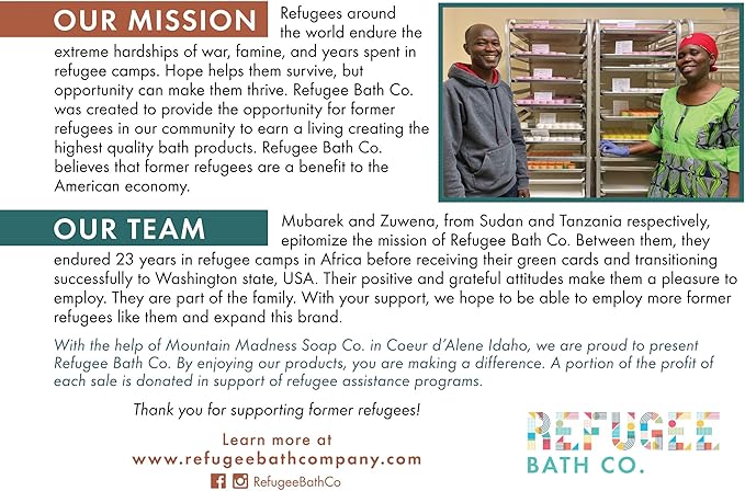 - Refugee Assistance: We believe that refugees are a benefit to our community. We created the REFUGEE BATH CO. to promote this belief by providing employment to refugees in our community. Your set of bath bombs was created by a refugee who spent a good portion of his/her life in a refugee camp before coming to the USA legally. A portion of the profit will be donated to refugee assistance programs.