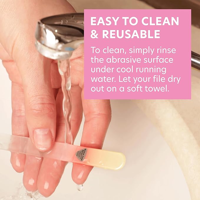 - Durable, Long-Lasting and Reusable Czech Glass Nail File: premium Czech ‘Bohemian’ glass, tempered (toughened) to ensure the glass is strong, wear-resistant & retains the integrity of the filing surface after multiple uses. The surface of an etched glass file lasts longer than non-etched nail files.