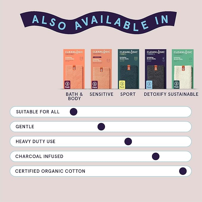 Cleanlogic Body Exfoliating Cloth, Stretchy Detox Charcoal Infused Exfoliator Bath and Shower Washcloths, Reusable Daily Skincare Tool, 3 Count Value Pack