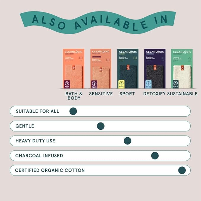 Cleanlogic Body Exfoliating Cloth, Stretchy Sport Exfoliator Bath and Shower Washcloths Ideal for Post-Workout Cleanse, Daily Skincare Tool, 3 Count Value Pack