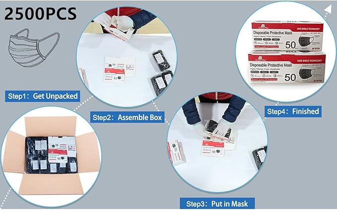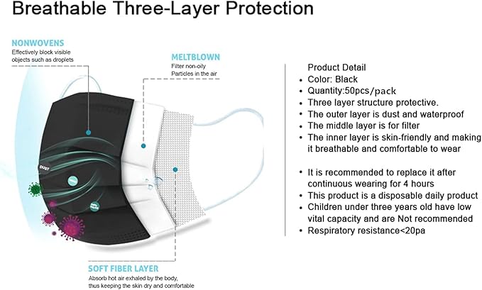 - Fabric type : 2000 Pcs BLACK Disposable Face Masks (40 Packs, 50pcs/Pack )