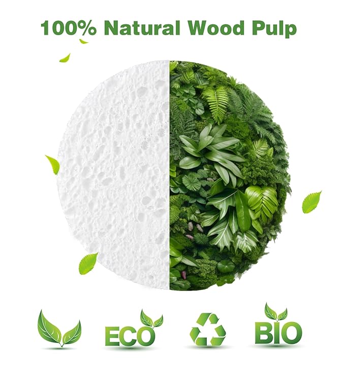 - 【NATURAL & Safe】: Made of 100% natural sponge extracted from wood pulp, good absorbency .Tips: Absorb water and becomes soft to touch before use