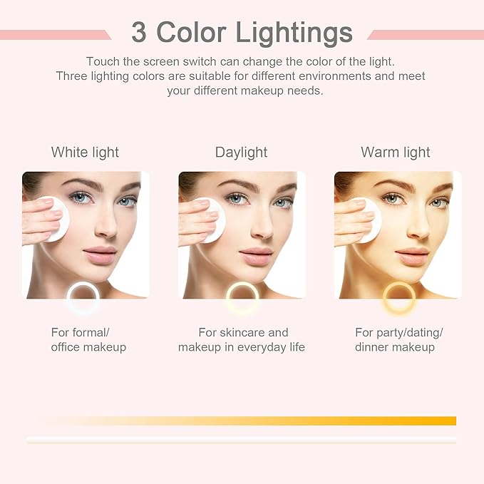 - 【 Powerful Light Brightness 】- This lighted makeup mirror surrounded by 72Pcs bright LED lights that can give you great assistance for making up and make you have perfect viewing while applying make up in dark or poorly lit areas. You can choose different light colors, white light, warm light and natural light according to your needs.