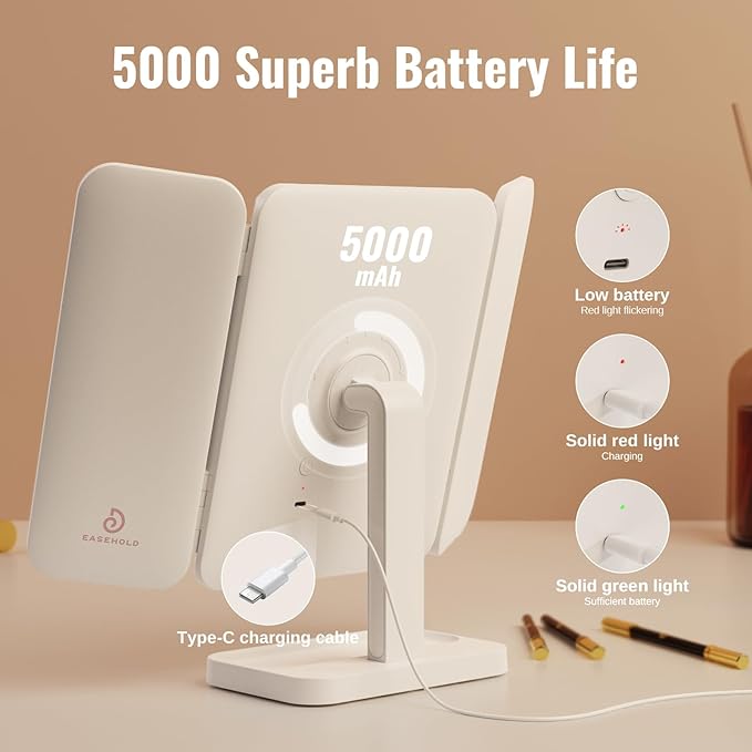 - 【Long-Running 5000 mAh Battery】EASEHOLD Vanity Mirror with a rechargeable 5000 mAh Li-ion battery sets itself apart from those using batteries / micro USB charging ports, as this battery features a more convenient TYPE C port to share the charging cable with your phones. One single charge lasts for 15 days (20mins/day).