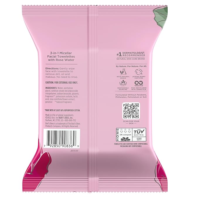 - NOURISHING INGREDIENTS: Three 30 ct. packages of Burt's Bees Micellar Facial Towelettes With Rose Water