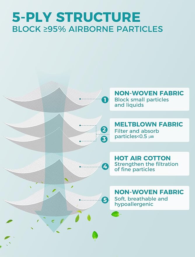 - More Breathable KN95 Masks - Compared with other masks that have to increase thickness to achieve the required filtration efficiency, ours can be lighter and thinner while ensuring the filtration effect. The electrostatic polarization processed meltblown fabric will spontaneously absorb the tiny particles (less than 0.0005mm) around them, so it has higher filtration efficiency with the same thickness.
