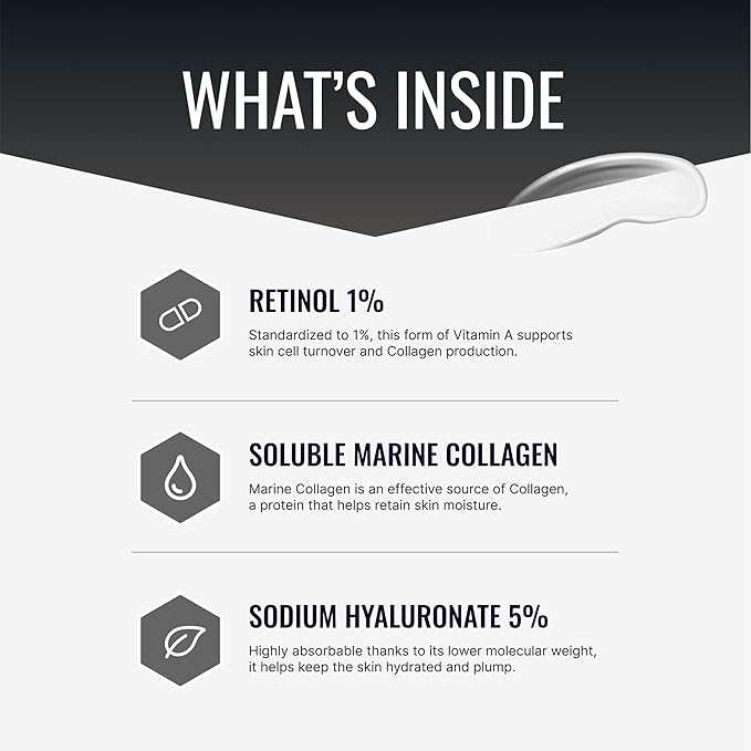 - Plump It Up - The powerful combination of Retinol and 5% Soluble Marine Collagen helps to plump and smooth the skin while enhancing skin tone.