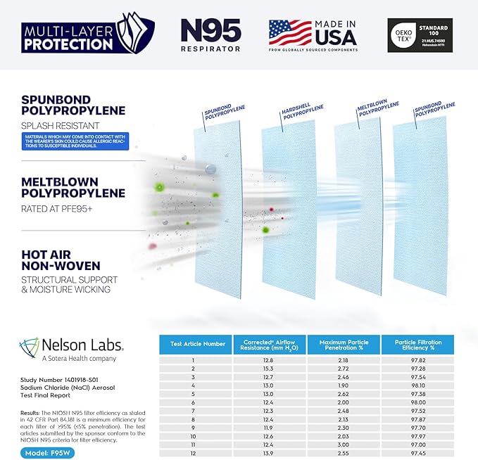 - Superior Protection & Breathability - BNX’s multi-layer filtration technology provides maximum protection, comfort and breathability. The active filter layer of these N95 masks is composed of ultra-high grade electrostatically charged meltblown polypropylene. Extremely breathable up to 50%+ more breathable than NIOSH minimum requirement.