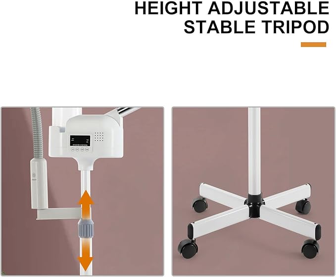 - Easy To Use - Facial steamer machine with 4-leg wheeled stable stand base that allows you to move around in the salon freely. Flexible arm can rotate left and right with 360 degrees and flip up and down 180 degrees. High adjustable from 40"-48"