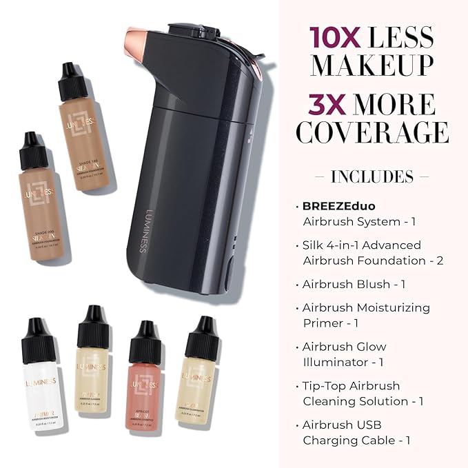 - 10X Less Makeup, 3X More Coverage: The LUMINESS BREEZE Duo is a super convenient way to quickly & easily conceal fine lines, wrinkles, and imperfections. It applies makeup & skincare in an ultra-fine mist to transform your skin. Includes 1 BREEZE Duo Device, charger, a 0.5-oz Silk Advanced Foundation Shade 9, a 0.5-oz Silk Advanced Foundation Shade 10, a 0.25-oz Apricot Blush, a 0.25-oz Glow Highlighter, a 0.25-oz Moisturizer Primer, and a 0.25-oz Tip-Top Airbrush Cleaning Solution.