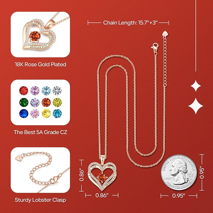 • There are 12 beautiful colors of birthstones,each representing a month of the year.The birthstone necklace,featuring high-quality Cubic Zirconia stones,makes a ideal birthday gift for women.The stones symbolize each month's unique birthstone:Garnet for January, Amethyst for February, Aquamarine for March, April birthstone, Emerald for May, Alexandrite for June, Ruby for July, Peridot for August, Sapphire for September, Tourmaline for October, Citrine for November, Turquoise for December