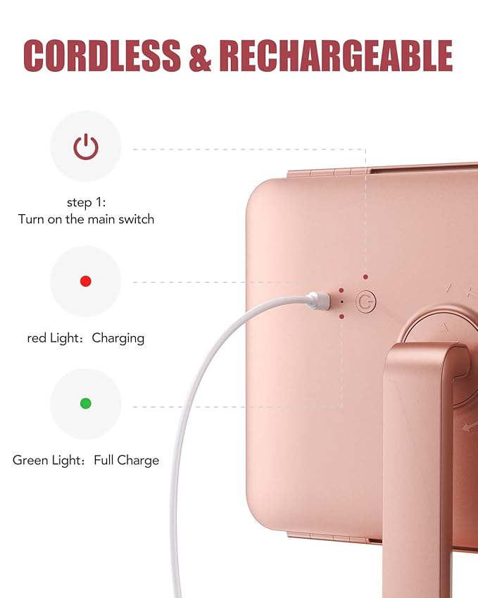 - 【Gorgeous Rose Gold Color】(Mirror shell, column and base) Made of high-quality ABS material, excellent wear resistance, recyclable for secondary use, add an anti-shatter film on the back to effectively prevent it from breaking. Gorgeous feminine design with attractive rose gold color, matt spray paint technology, making the color uniform and translucent. Comfortable lubrication just as touch the pearl. Superior lighted makeup mirror is an ornament and an ideal choice for a high-end gift.