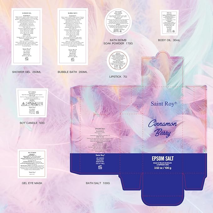 - [FULL 10Pcs PAMPERING BATH GIFTS SET FOR WOMEN ] - This Bath Spa Gift Baskets for Women Includes Everything You Can Pamper Yourself At Home, Saint Roy Bath Sets for Women Gift Contains Bubble Bath, Shower Gel, Bath and Body Oil, Epsom Salt, Cinnamon Scented Soy Candle , Lipstick, Bath Puff, Bath Bomb Milk Soak Powder, Gel Eye Mask and An Shiny Basket