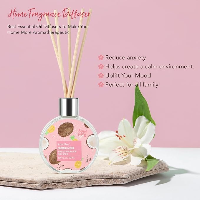 - [ Scents Home Reed Oil Diffuser Set ] It can be an accessory for your desk and your restroom has a Warm scent. Put it in the corner can effectively purify the air .Relieve Stress In Any Room: Enjoy Pleasant Aroma And Decorate Your Indoor Or Outdoor Space, Including Your Home, Office, Bedroom, Kitchen, Living Room,And Bathroom. A Mixture of Rose & Coconut Scents Smells Fresh and Pleasant, And Leaves a Refreshed Floral Faver and Pure Feeling. Helps you Unwind & Relax