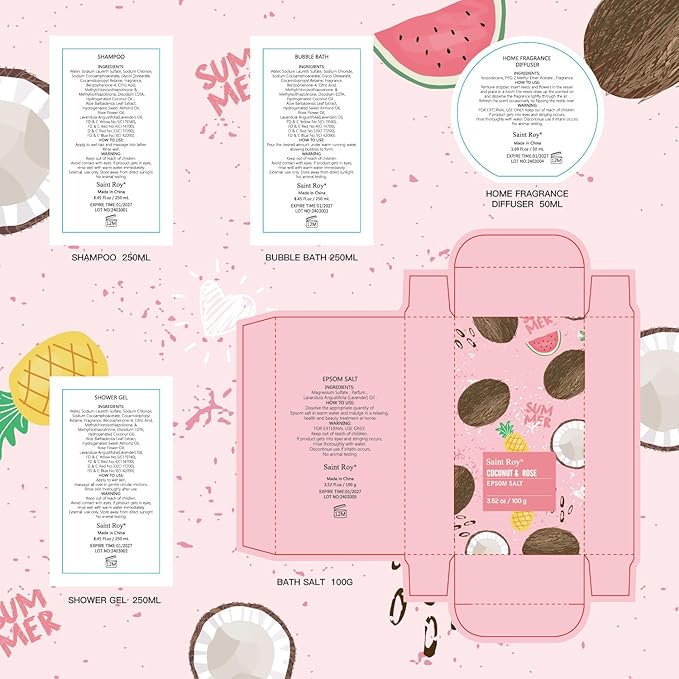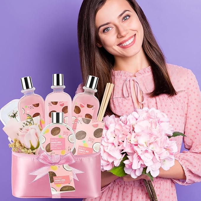 - [ Spa Gift Baskets for Women Coconut Rose ] Everything in Bath Set is Filling with All the Skin Needs Ingredients of Moisturizing & Softening Skin. Relaxing Body and Bath Gift Set Includes Bath Shower gel, Bubble bath, Hair Shampoo, Home Diffuser Oil, 5pcs Reed diffuser sticks, Pure Epsom Salt, Rose Bath Soap flowers, Make-up Bag with Cute Mirror. Is Best spa Gifts for Women, Teen Girls also can Use as a Travel Bag. This Girls Spa Set Offers Luxurious & Perfect Relaxing Bath Experience