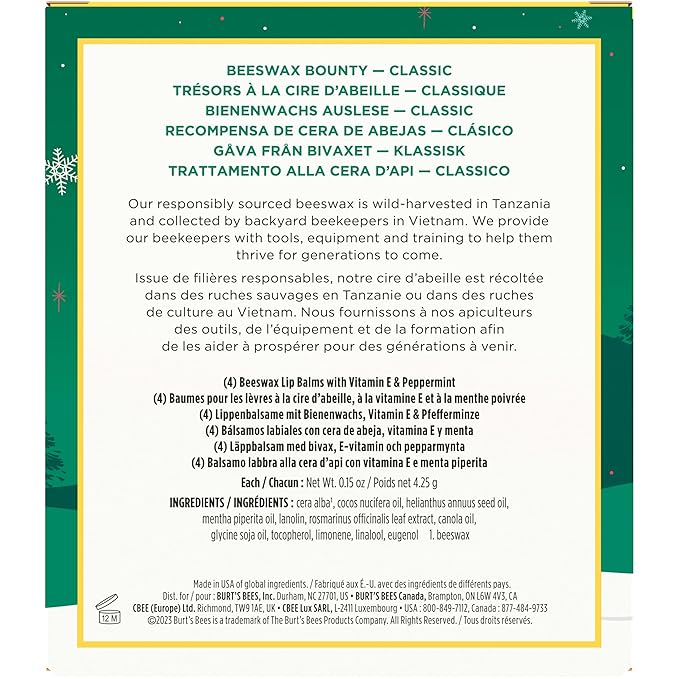 - PACKAGE CONTENTS: Each Burt’s Bees Lip Balm Gift Set contains four 0.15 oz. lip balm tubes of Burt's Bees Beeswax Lip Balm with Vitamin E and Peppermint Oil