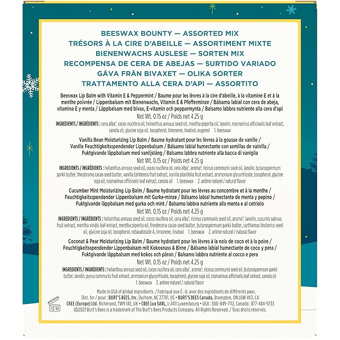 - PACKAGE CONTENTS: Each Burt’s Bees Lip Balm Gift Set contains four lip balm tubes, with one 0.15 oz. tube each of Burt's Bees Beeswax, Vanilla Bean, Cucumber Mint, and Coconut and Pear Lip Balm