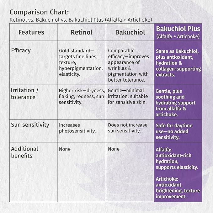 - PLANT-BASED RETINOL ALTERNATIVE – Bakuchiol, a botanical retinol substitute, helps visibly enhance skin tone and texture for a more even, radiant look without the common irritation of synthetic retinol.