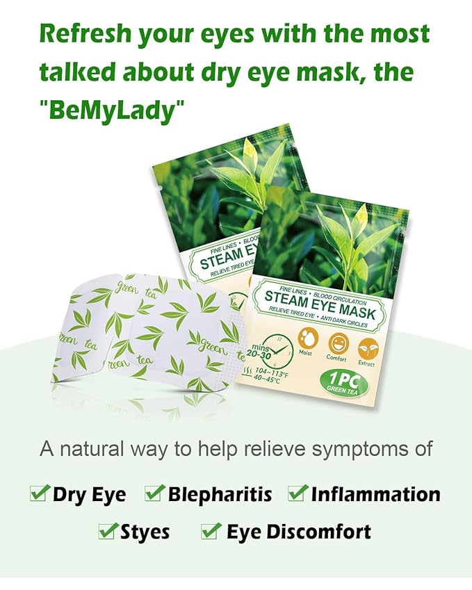 - 😇【Green Tea Self Heated Eye Mask 】Our steam eye masks can relieve your eye fatigue,moisturize your eyes,improve your sleep quality,reduce dry puffy eyes and dark circles.This self warming heated eye mask will promote your blood circulation, release fine moist steam, comfort the skin around eyes, let tired eye enjoy the steam, fully relieve dry eyes and eye astringent with just 30-minute eye spa.